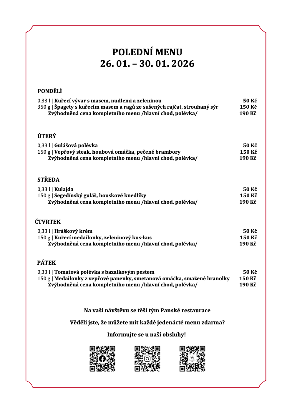 Přinášíme Vám aktuální týdenní menu na 26. 1. - 30. 1. 2026.