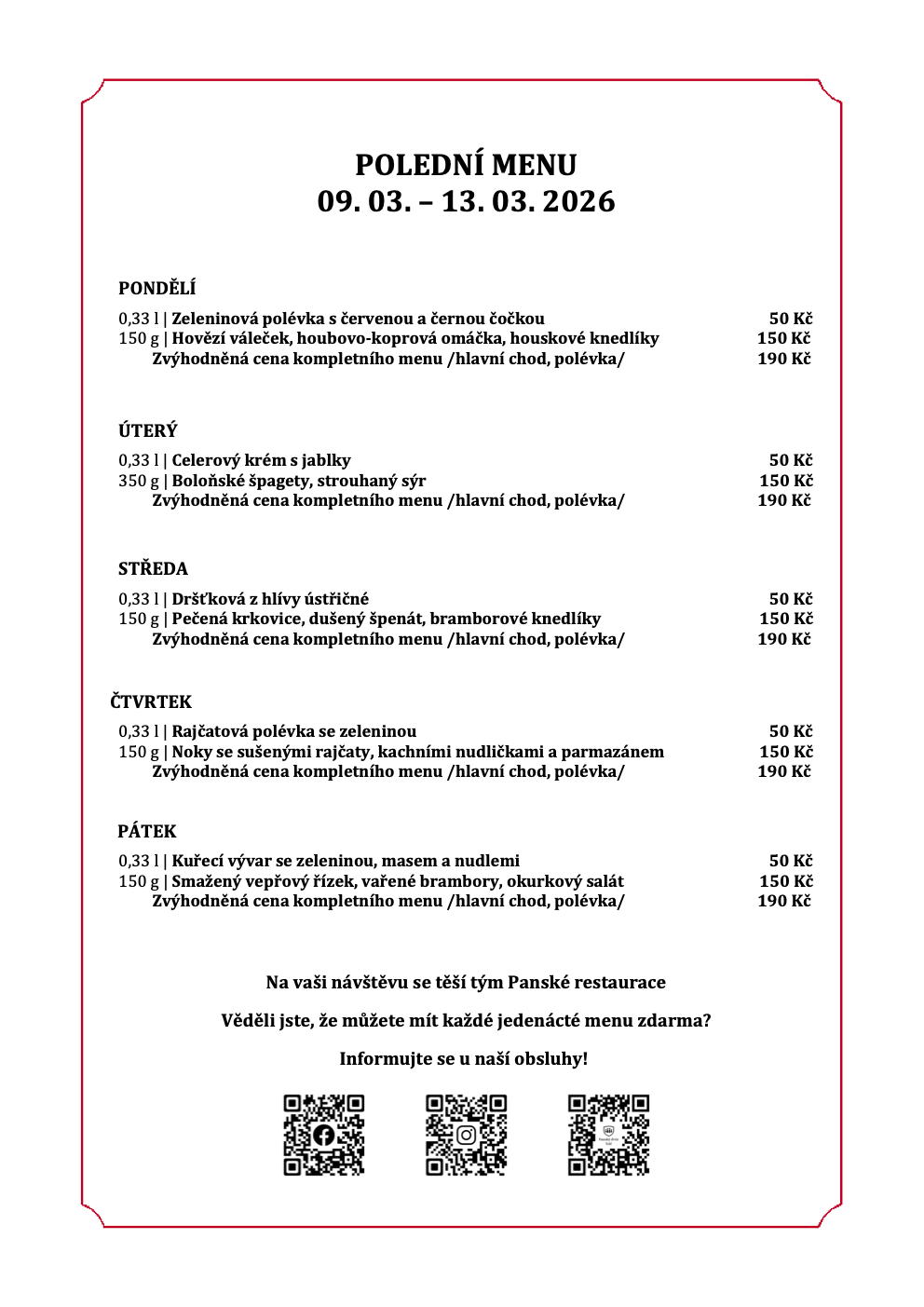 Přinášíme Vám aktuální týdenní menu na 9. - 13. 3. 2026.