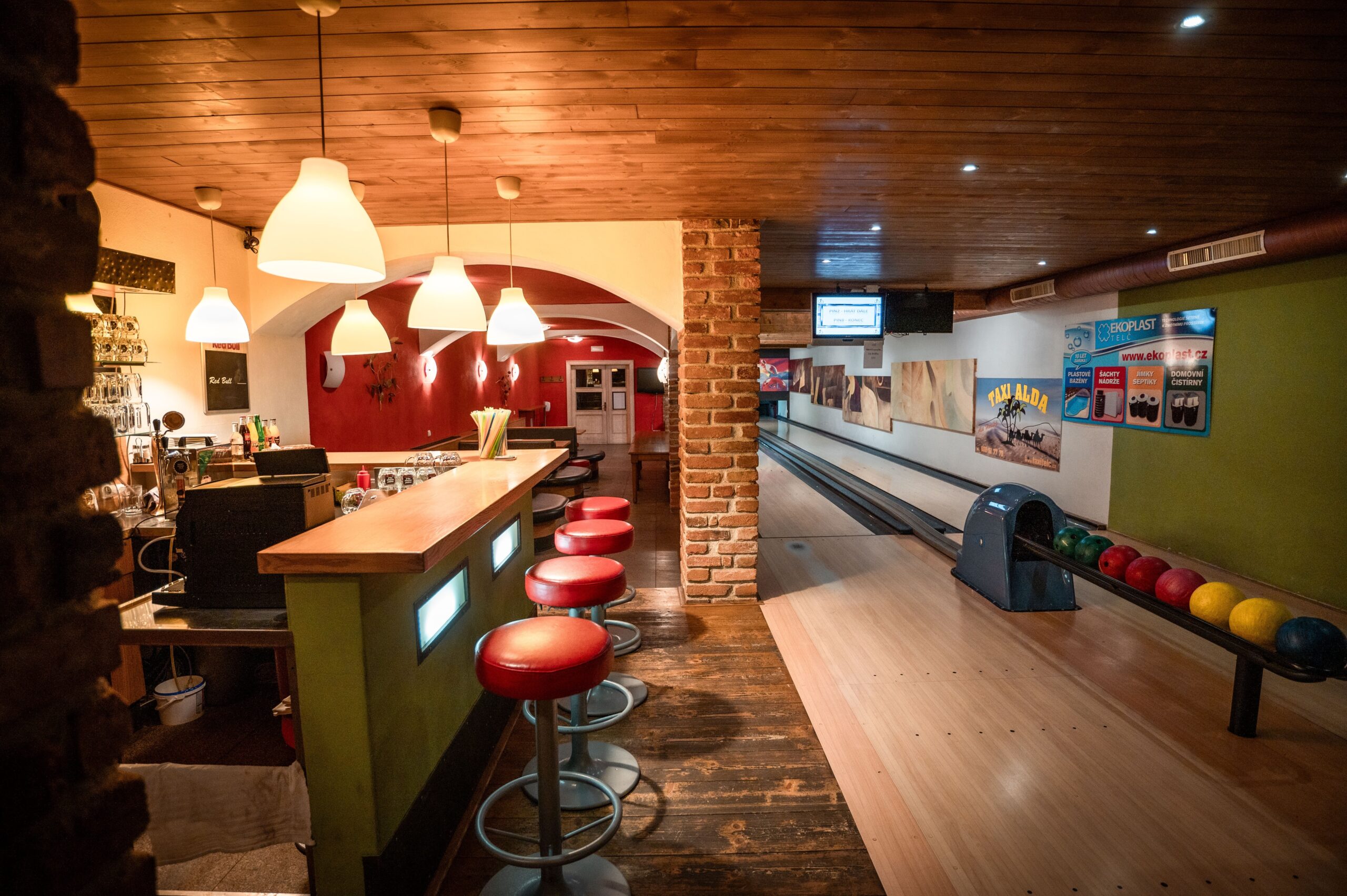 V suterénu najdete 2 bowlingové dráhy, bar a nabídku drobného občerstvení - na objednávku. Bowling je součástí Hotelu U Hraběnky hned naproti budově Panského dvora.